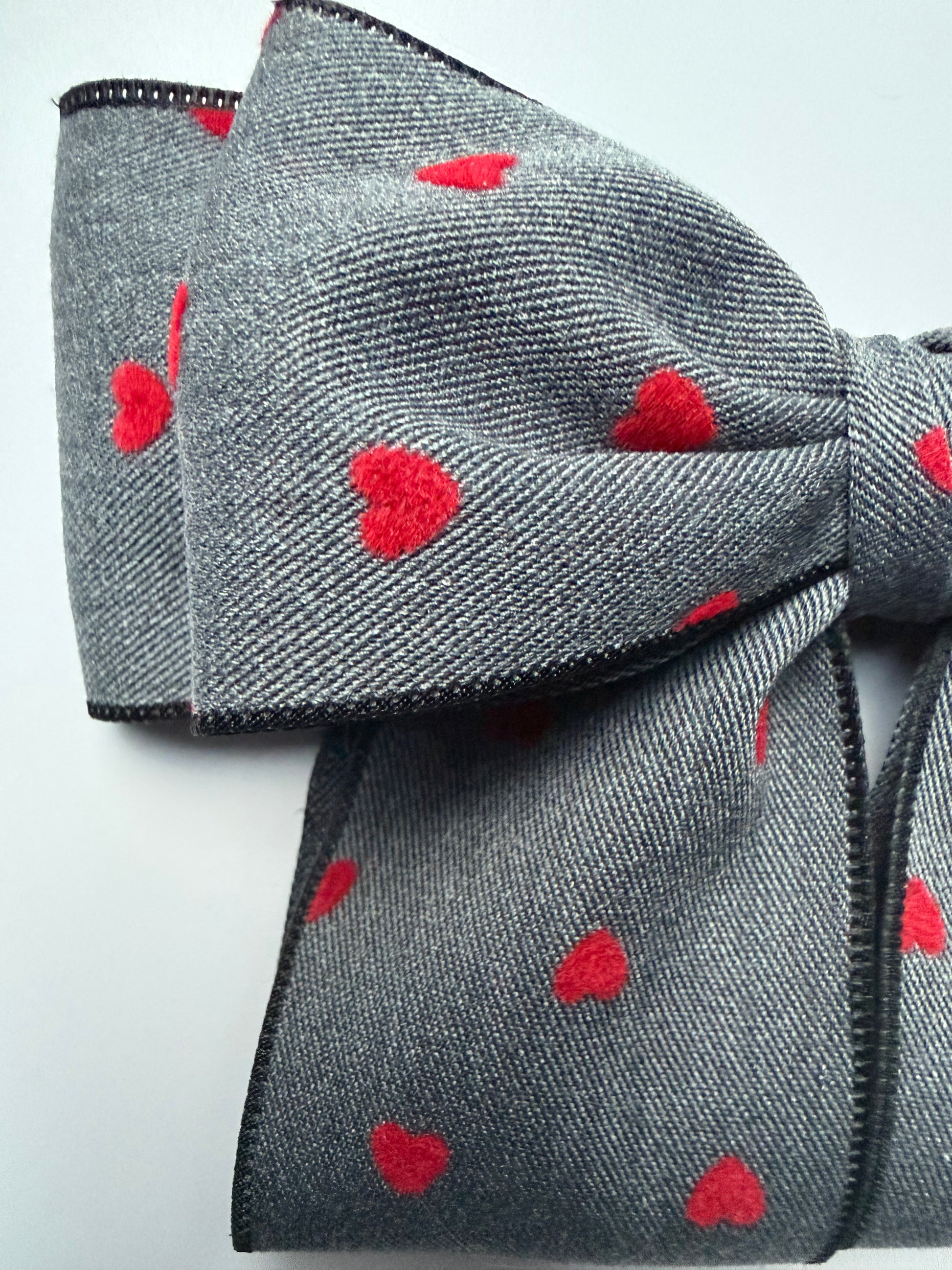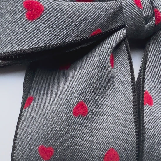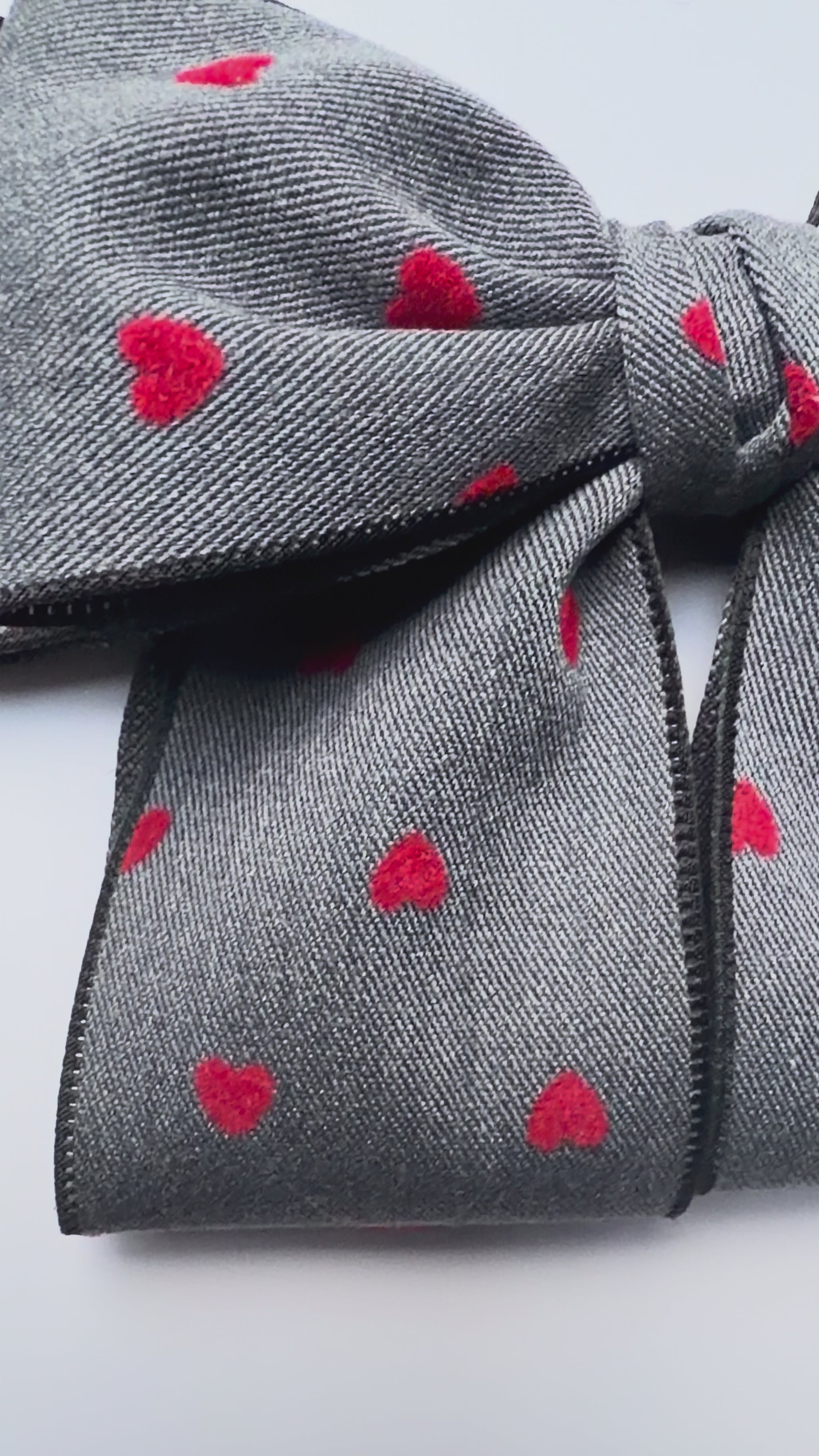 Each bow is individually shaped and secured by hand, ensuring a lightweight yet structured finish that holds its form beautifully. The grey base with delicate red heart detailing makes it a timeless accessory, perfect for daily wear, gifting, or special occasions.